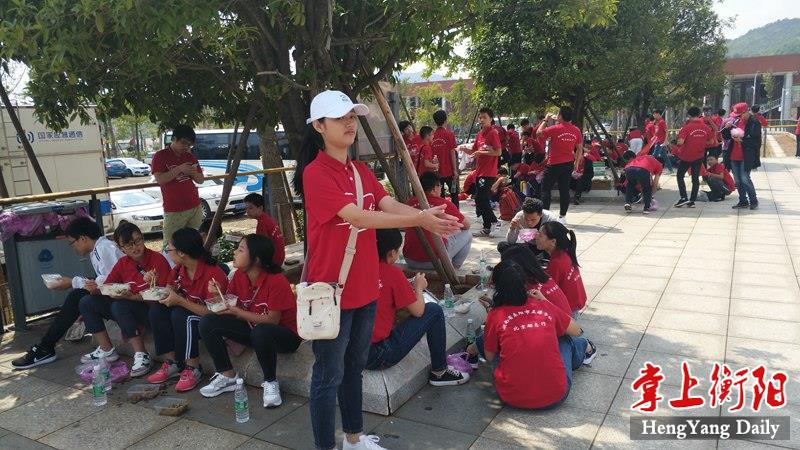 一下车,师生们在韶山换乘中心广场就地吃起了学校准备的盒饭。一百多人席地而坐,吃着香喷喷的饭菜,偶尔有饭粒掉到地上,同学们吃完饭都会用筷子夹到包装袋里。吃完中餐,地上非常干净,一点垃圾都没有,现场的保洁员都朝同学们竖起了大拇指。