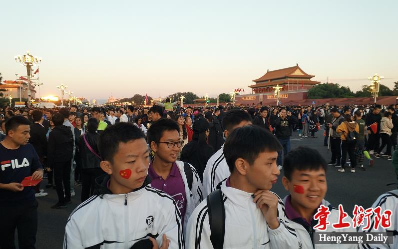 凌晨5时多,师生们来到天安门广场。广场花团锦簇,人流如织,同学们纷纷掏出手机争相拍照。169班廖明同学为了抓拍到满意的镜头,特别买了自拍杆。6时多,国旗队的战士迈着整齐的步伐走出城门,在雄壮的国歌声中,五星红旗高高升起……人们一个个举起手机抓拍这个难忘的瞬间。