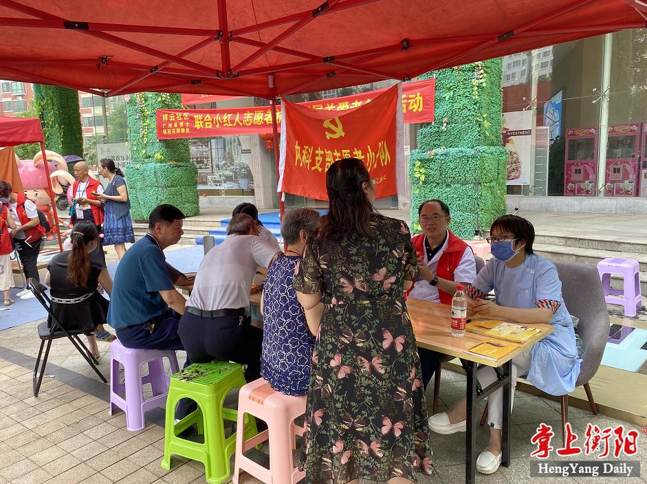 义诊组由市第一人民医院内科支部护士为老年人测血压,其中最为显眼的身影是衡阳援鄂医疗队员、“湖南好人”肖玲英。活动一角还有志愿者为老人理发。该活动共发放黄手环105只、定位帖4份、黄手环宣传资料150余份,并为100余名老人解答咨询、测量血压、理发等。