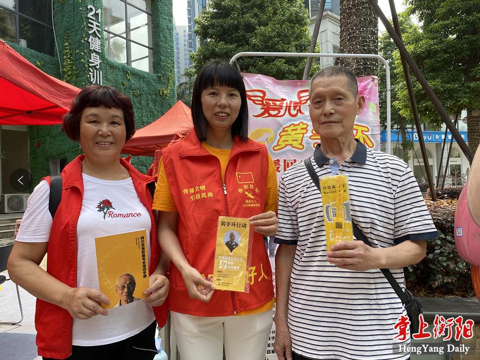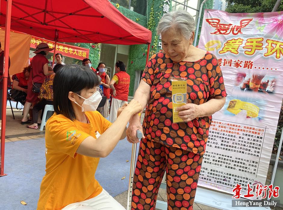 活动9点正式开始,衡阳市中心医院神经内科主任胡新平首先为前来领取黄手环的老人进行科普知识讲座。随后,志愿者教老年人做手指操预防痴呆,并为他们发放、普及使用黄手环。活动中,不少老人和其子女主动表示,自愿加入黄手环宣传队伍,帮助更多老人平安回家。