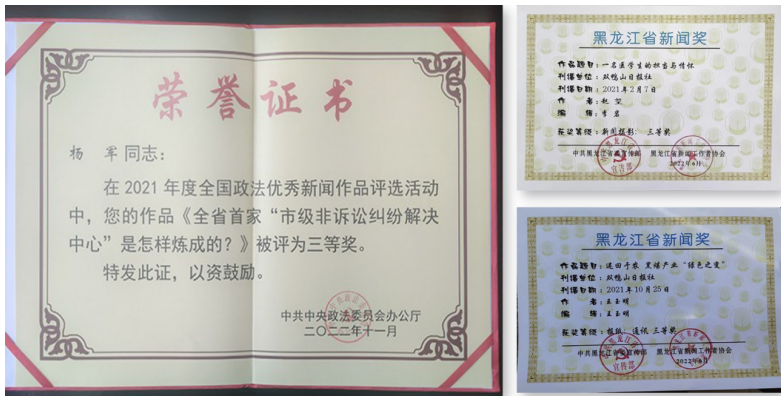 (1)国家级荣誉:2022年11月,《全省首家“市级非诉讼纠纷解决中心”是怎样炼成的?》被中共中央政法委员会办公厅评为“全国政法优秀新闻作品三等奖”。